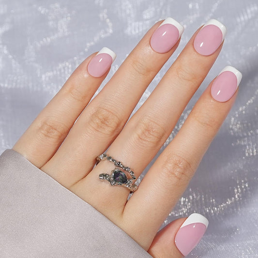 French Tip Press On Nails - BTArtbox 30 PCS Almond Fake Nails, Fit Perfectly & Natural Reusable Silver Outline Soft Gel Nails with Nail Glue and Jelly Glue in 16 Sizes, Rock Me