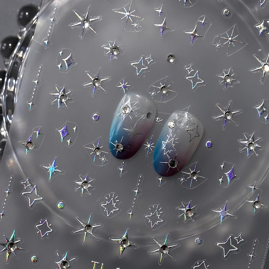 Glitter Diamond Stars Nail Art Stickers 3D Self-Adhesive Crystal Silver Decals Luxury with Rhinestones Stars Charms Design Stickers for Women DIY Manicure Decorations