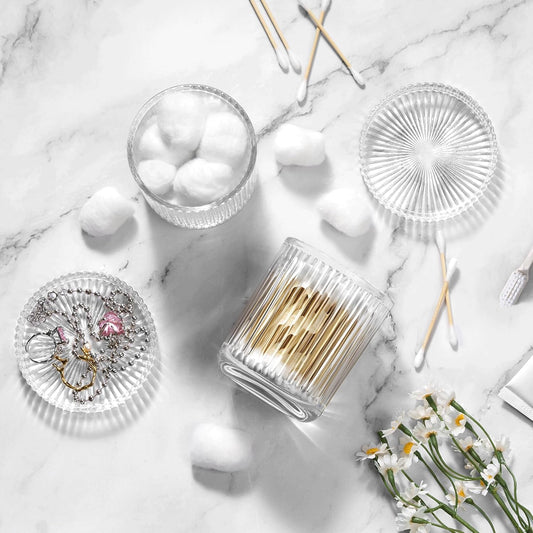 Glass Qtip Holder with Vanity Tray, Apothecary Jars Bathroom Accessories Bathroom Canisters Organizer Countertop Q Tip Holder for Cotton Ball Round Swab Pad Hair Ties Floss Perfume Jewelry