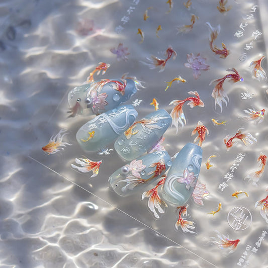 Golden Koi Fish Nail Art Stickers 5D Embossed Self-Adhesive Lotus Nail Decals for Acrylic Nails Lucky Red Koi Fish Designs Nail Sticker Cute Goldfish Nail Decal for Women DIY Art Nails Decor Supplies