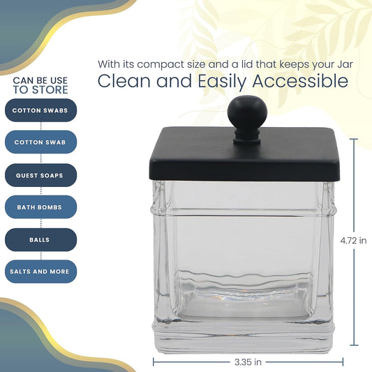 H Halston Apothecary Glass Cotton Jar Holder for Qtips, Cotton Balls, Floss, Storage Canister, Bathroom Organization, With Matte Black 304L Stainless Steel Lid, Makeup Vanity Organizer