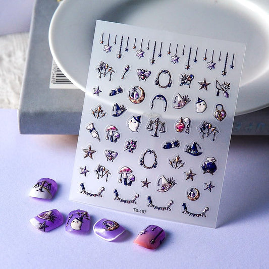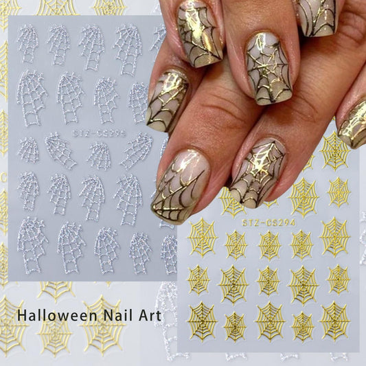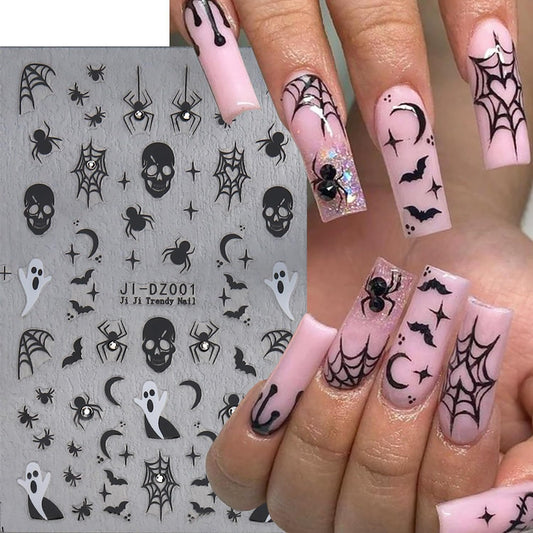 Halloween Nail Art Stickers - 9 Sheets 3D Self-Adhesive Design Decals With Ghost, Pumpkin, Spider, Bat, Black Gold Silver Web - DIY Nail Decoration for Women