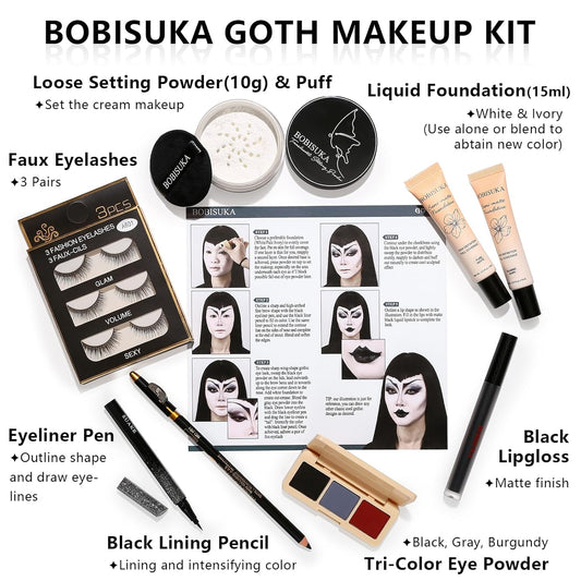 Halloween Goth Makeup, Complete Goth Make Up Set with White Foundation, Black Lipstick, Dark Smokey Eyeshadow Kit for SFX Gothic Makeup, Cosplay, Costume Party, Theater and Film