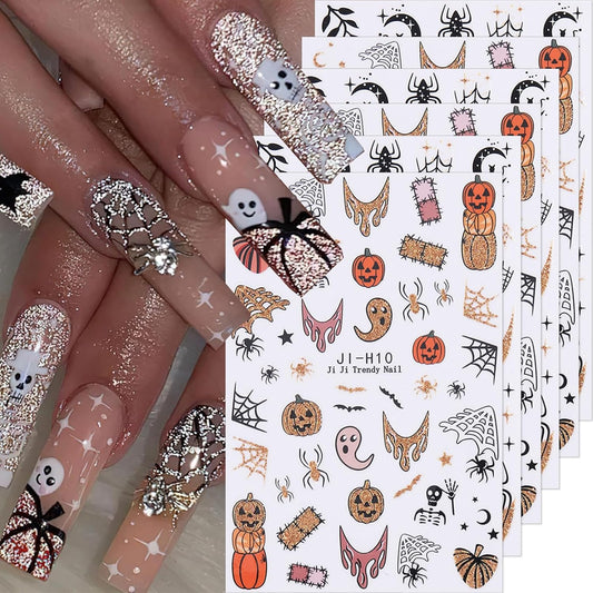 Halloween Nail Stickers 6PCS - Spooky Ghost Pumpkin Skull Cat Glitter Nail Decals, 3D Self-Adhesive Nail Art Supplies for Women, Festive Holiday Nail Decorations