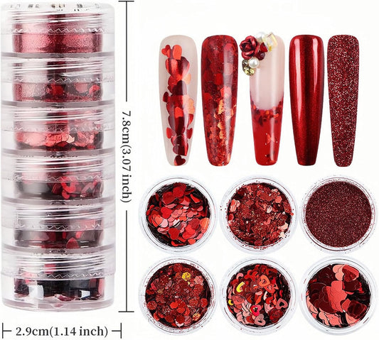 Heart Nail Art Glitter Red Valentines Day Nail Sequins Flakes, Red Manicure fine Glitter Powder, 3D Holographic Round Hexagon Nail Stickers Decals Supplies Nail Charms for Women 6 Box