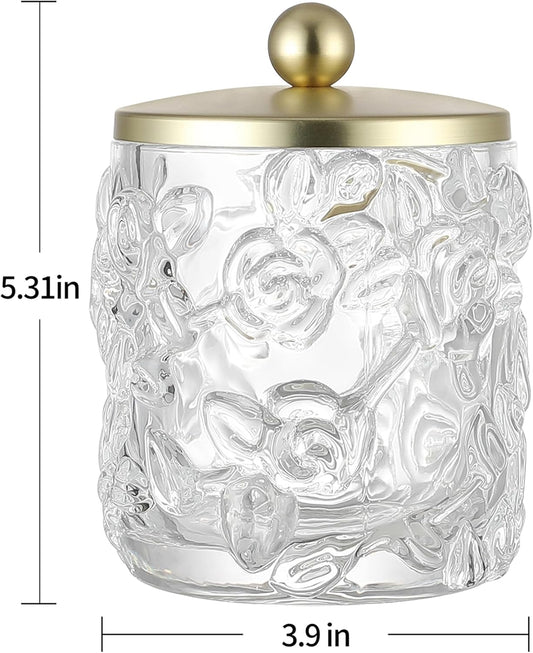 Home Glass Cotton Jar Holder with Lid, Elegant Bathroom Storage Canister for Qtips, Cotton Balls, Floss, Makeup Organizer, Vanity Bathroom Organization