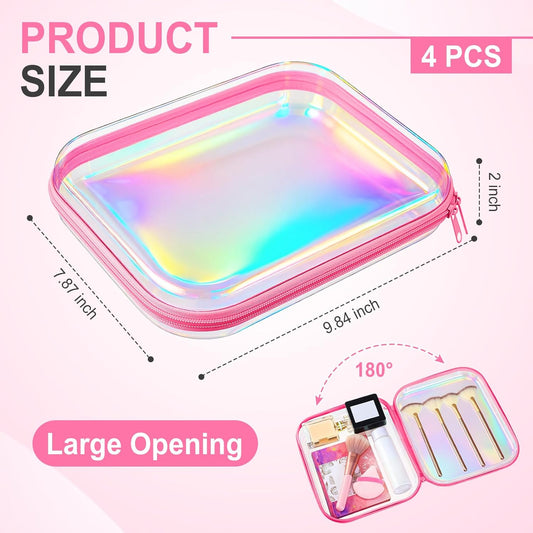 Hoolerry 4 Pcs Hard Clear Zipper Case Makeup Bags Plastic Pencil Pouch Transparent Storage Box Containers for Cosmetics, Snacks, Building Blocks, Puzzles(Pink Laser,9.8 x 7.9 x 2 in)