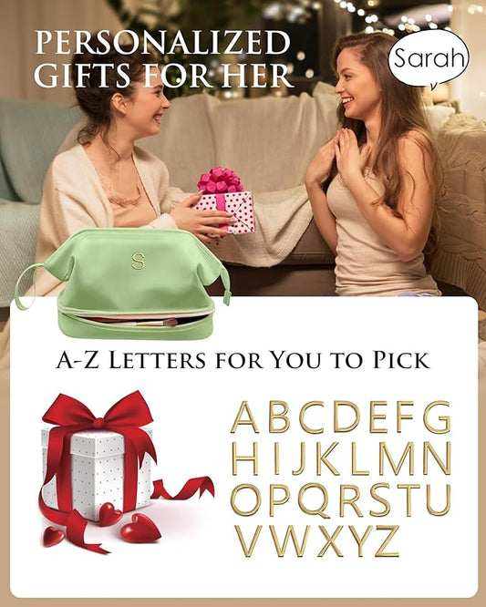 Gift Ideas for Woman Initial Large Makeup Bag, Personalized Birthday Gifts Cosmetic Bag with Makeup Brush Organizer, Waterproof, Large Capacity Travel Toiletry Bag for Women Makeup pouch