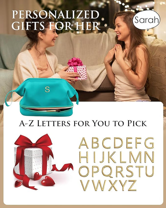 Womens Gift, Initial Makeup Bag, Travel Gifts, Personalized Bags, Waterproof Double Layer Cosmetic Bag, Large Capacity PU Leather Makeup Bags Letter Travel Toiletry Bag, Friend Gifts