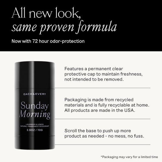 Each & Every Aluminum Free Deodorant for Men & Women - All Natural Deodorant for Sensitive Skin, EWG Verified - Clean, Baking Soda-Free, Plant-Based Fragrance, Unscented Fragrance-Free, 2.5oz