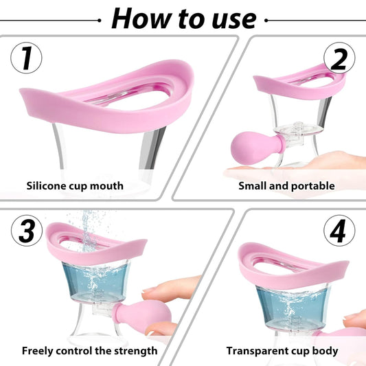 Eye Wash Kit, Transparent Eye Cups for Eye Wash Bath Kit Silicon Eyewash Kit Manual Air Pressure Eye Cleaning Cup Tool Effective Eye Flush Kit Portable Eye Care Device with Storage Container (Pink)