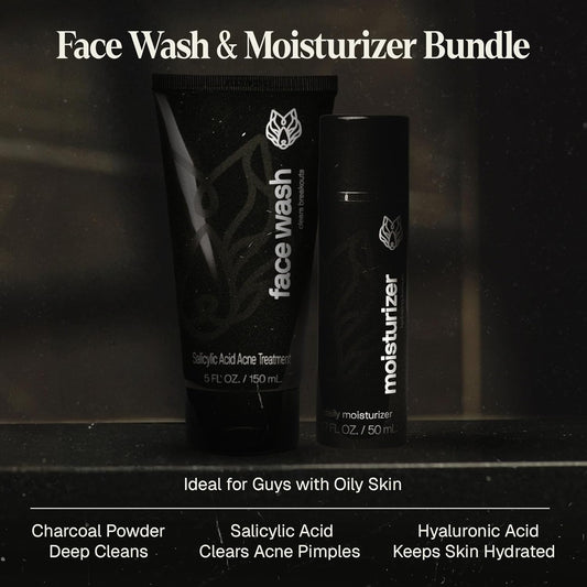 Black Wolf Face Wash and Oil-Free Moisturizer Gel Bundle for Oily Skin, Deep Clean- 2pc Bundle- Charcoal Powder and Salicylic Acid Reduce Acne Breakouts and Cleanse Your Skin- Gift Set for Men