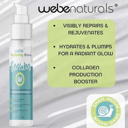 WEBE Naturals Snail Mucin 94% Hydrating Glow Serum | 1.3% Hyaluronic Acid & N-Acetyl Glucosamine | Collagen Boosting, Plumping, Anti Aging, Intense Moisturizing Serum for Radiant, Dewy Skin