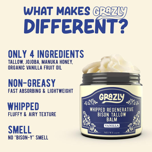Whipped Bison Tallow Balm w/Manuka Honey, Jojoba, Organic Vanilla - Grass-Fed & Finished Organic Tallow Face Moisturizer - Face & Body Cream for Acne-Prone Skin - Nourishing Skincare (2.5 oz)
