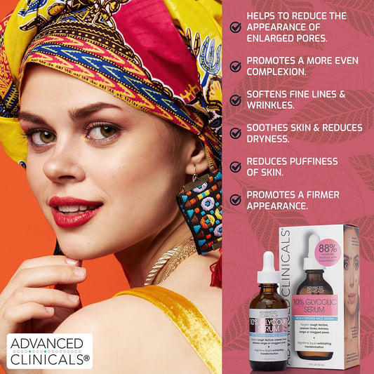 Advanced Clinicals 10% Glycolic Acid Serum For Face | Exfoliating AHA + Lactic Acid + Salicylic Acid Serum | Facial Chemical Peel Skin Care Treatment For Acne, Large Pores, & Dark Spots. 1.75 FL Oz