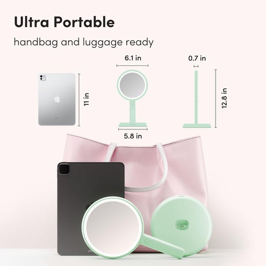Fancii Cami Handheld Travel Makeup Mirror with Lights, Rechargeable, Extra Large, Double Sided 5X / 1X Magnifying Mirror - 3 Color Lighting, Handheld or Vanity (Pistachio)