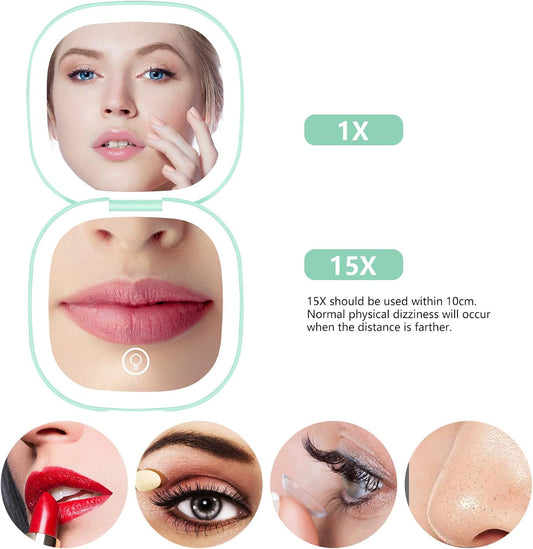 Compact Mirror with Light,15X Magnifying Travel Mirror for Purse, Dual LED Pocket Mirror with 3 Color Modes, Auto Shut-Off, Portable Makeup Mirror, Essential Mini Travel Magnifying Mirror
