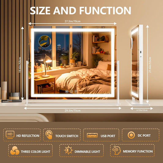 Vanity Mirror with Lights, 32" x 22" Large Lighted Vanity Mirror with Dimmable 3 Modes, LED Makeup Mirror, USB Charging Port, Tabletop or Wall-Mounted Square White