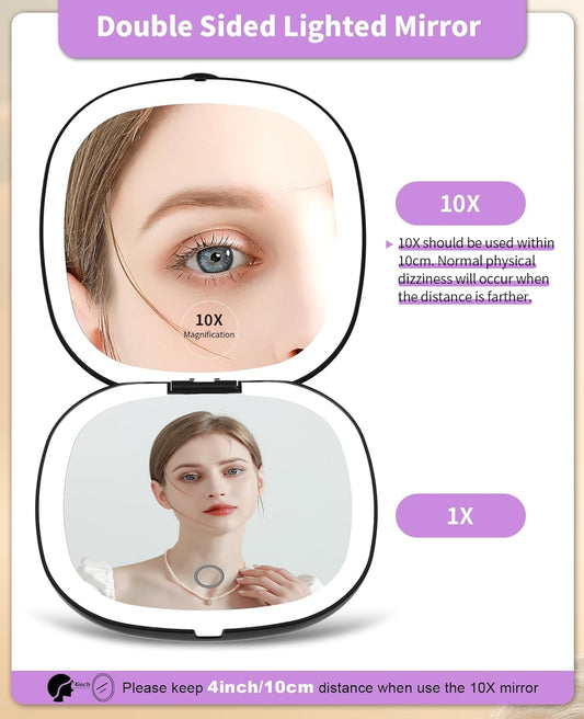 WOBSION Rechargeable Lighted Travel Makeup Mirror,1x/10x Compact Magnifying Mirror with Lights,Portable for Bag,4inch,Gift,Black