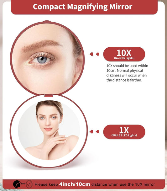 WOBSION Travel Compact Mirror,Portable 1x/10x LED Makeup Mirror with Magnification,Handheld 2-Sided Pocket Mirror, 3.5in Small Mirror for Purse,Handbag,Gift,Wine Red