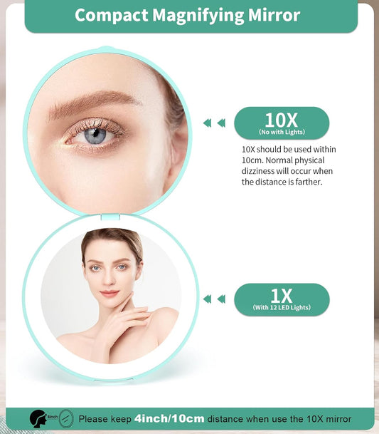 WOBSION Travel Compact Mirror,Portable 1x/10x LED Makeup Mirror with Magnification,Handheld 2-Sided Pocket Mirror, 3.5in Small Mirror for Purse,Handbag,Gift,Cyan&Black,2 Pack