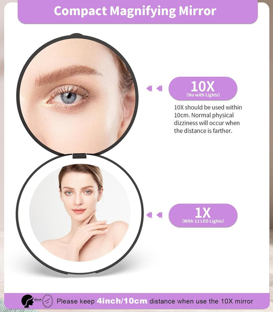 LED Compact Mirror – 1x & 10x Magnification | Travel Makeup Mirror with Adjustable Lighting | Handheld & Pocket-Sized Portable Mirror with Protective Pouch (Pink)