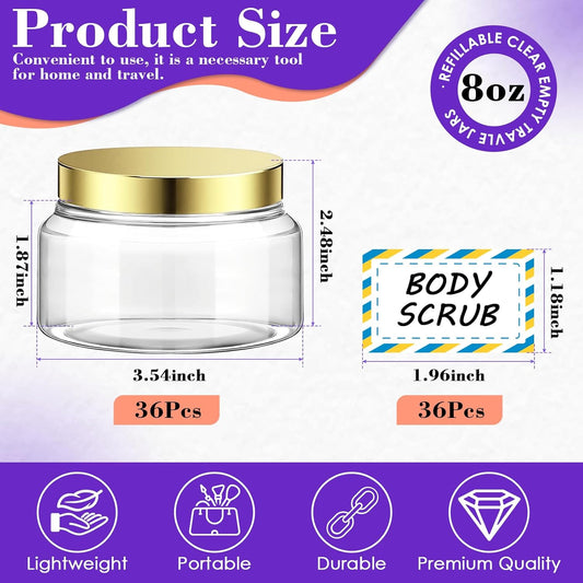 36 Pack 8 oz Amber Plastic Cosmetic Containers With Lids Refillable Clear Empty Travle Jars Containers for Body Butter,Sugar Scrubs,Cream,Lotions,Candy, Waterproof Label&Spatulas - (Black Lid)