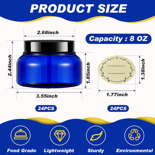 Tessco 24 Pack Plastic Jars with Lids Labels Empty Clear Plastic Jars Round Refillable Cosmetic Containers Body Butter Containers Bulk Sugar Scrub Bottle for Make Up(8 oz,Blue, Black)
