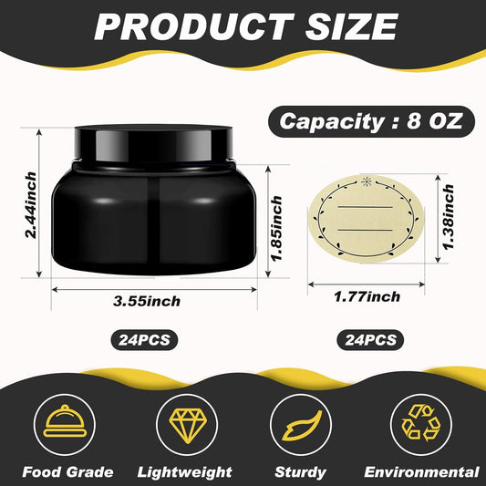 Tessco 24 Pack Plastic Jars with Lids Labels Empty Clear Plastic Jars Round Refillable Cosmetic Containers Body Butter Containers Bulk Sugar Scrub Bottle for Make Up(8 oz,Black)