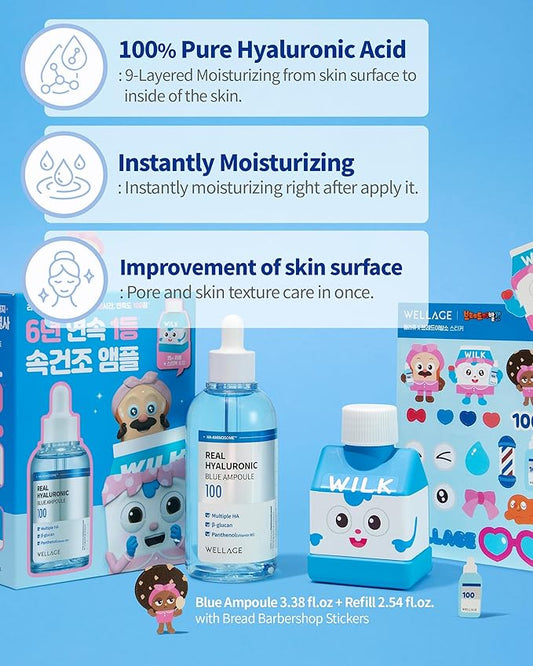 WELLAGE Real Hyaluronic Blue Ampoule 100, Korean Skincare, Fragrance Free Hyaluronic Acid Serum with Panthenol, Wild yam, Centella, Deep Hydration, Firming, Plumping, Non-Sticky 3.38 fl.oz.+2.54 fl.oz