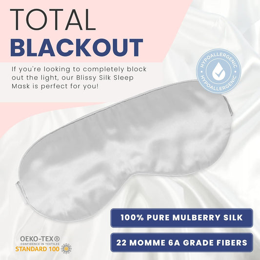 Blissy Silk Sleep Mask - Silk Eye Sleeping Mask for Women & Men for Total Blackout - 100% Pure Mulberry Silk, 22 Momme 6a Fibers - Blindfold Silk Sleep Mask Side Sleeper Eye Cover (Silver)
