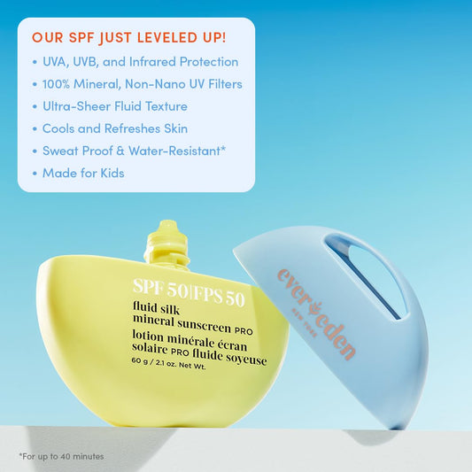 Evereden SPF50 Fluid Silk Mineral Kids Sunscreen: Clean Cooling Non-Nano UVA, UVB, & IR Protection for Sensitive Skin - Sheer, Lightweight, & Waterproof for Up to 40 Mins - Beach Day Toddler Sunscreen