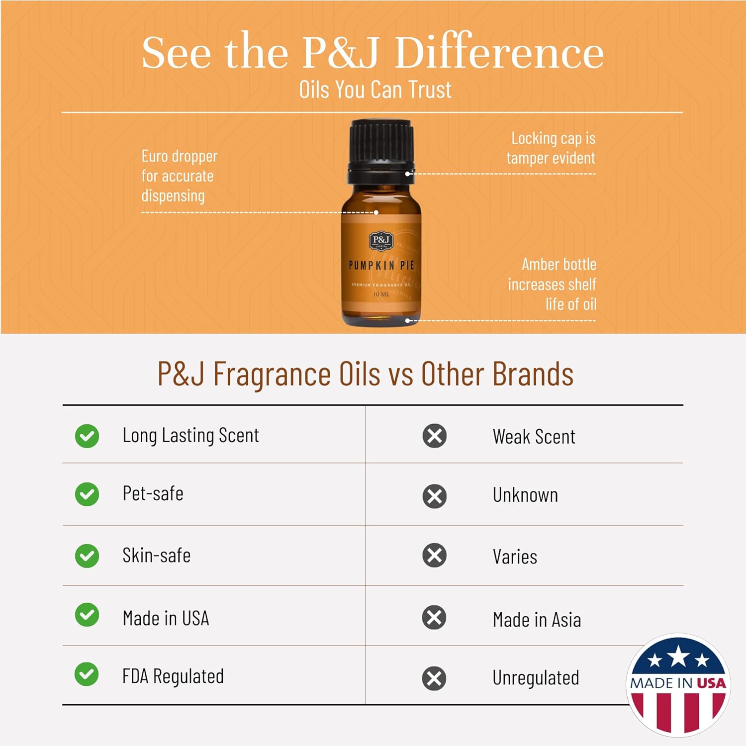 - Premium Grade: P&J fragrances oils are highly concentrated with a strong scent. With more than 30 years in the industry, these enhanced formulations were developed by our IFRA certified master perfumers. Our oils are safe and ideal for every home.