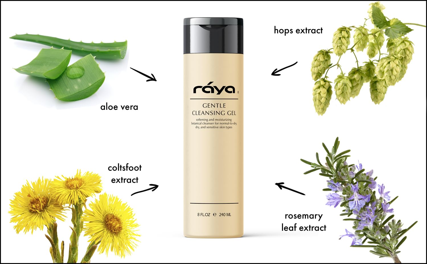 Raya Gentle Facial Cleansing Gel 8 oz (104) | Softening and Moisturizing Botanical Cleanser for Dry and Sensitive Skin| Helps Hydrate Smooth Complexion