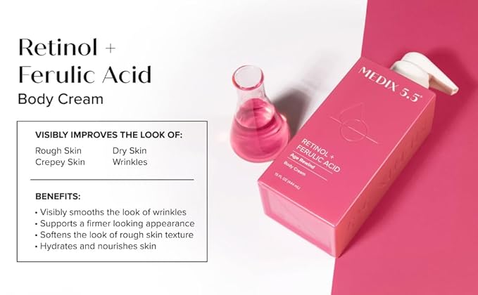 - NOURISHING INGREDIENTS FOR SMOOTHER LOOKING SKIN β Medix 5.5 Retinol Body Lotion Moisturizer Cream is the perfect combination of ingredients with natural-antioxidants to help promote a visibly radiant complexion and a more youthful look. Infused with Retinol, Ferulic Acid, Shea Butter, Vitamin E, Green Tea, & more to nourish skin, visibly enhancing its texture and tone. This blend promotes a smoother, more youthful appearance.