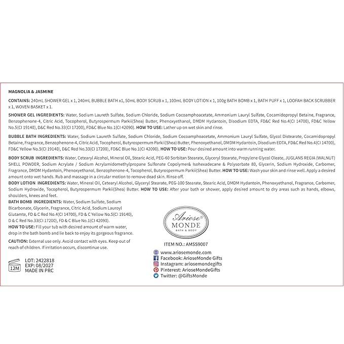 - SWEET & COMFORTING SCENT. This classic fragrance captures the essence of rich Magnolia and Jasmine, when taking a bath, you are sure to be fascinated by this intoxicating flora notes. Suitable for a relaxing bath or a rejuvenating shower, enhancing your daily self-care routine