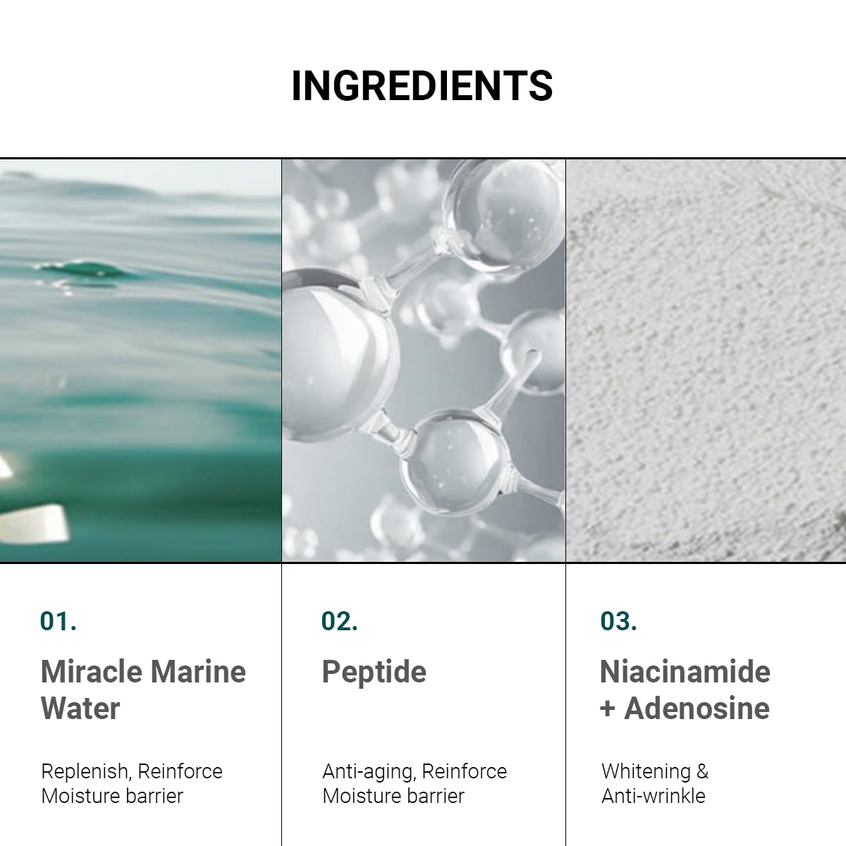 - SUPERCHARGED MARINE TREASURE: Miracle Marine Water (51% algae extract), Peptides & Niacinamide work together to deeply nourish, hydrate, and smooth the skin, tackling dryness and wrinkles at their source.