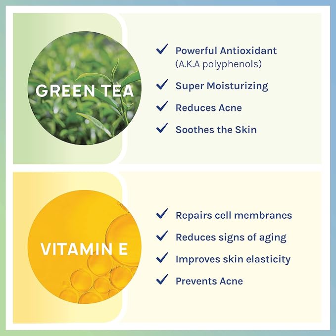 - Green Tea & Vitamin E: Infused with green tea and vitamin E to soothe and brighten skin.