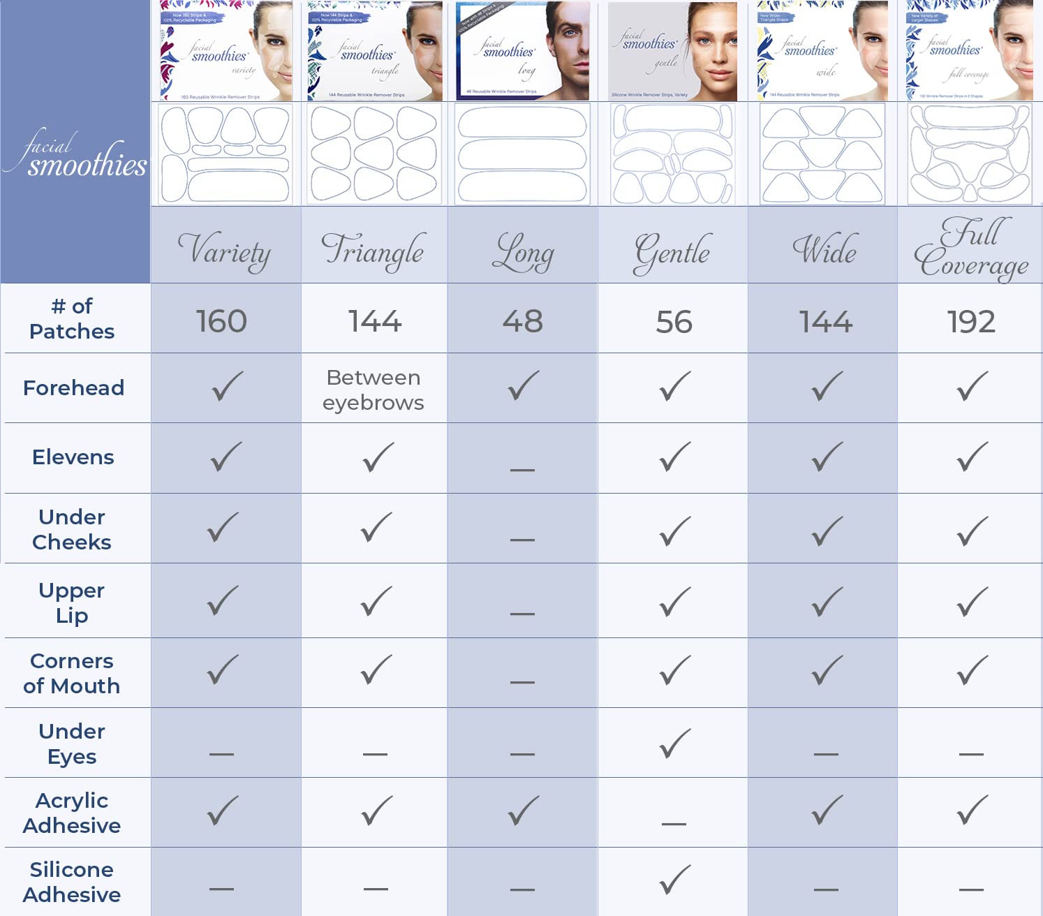 - Strong Adhesive: Smoothies are intended to stay secure overnight, but still gentle on your skin. Smoothies give you the freedom to use your favorite moisturizer or serum while still staying in place.