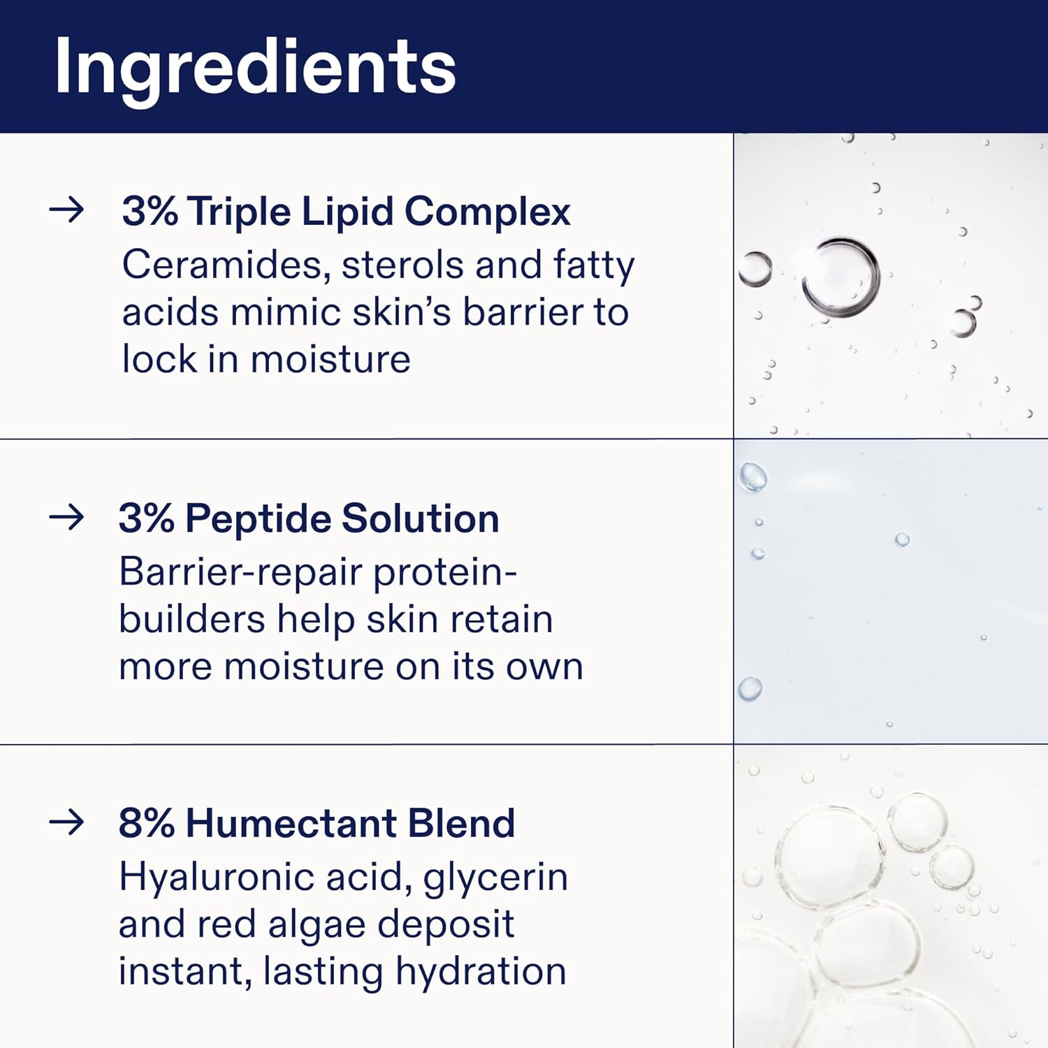 - INGREDIENTS - 3% Triple Lipid Complex mimics skin's barrier to lock in moisture. 3% Peptide Solution to weightlessly help skin retain moisture. 8% Humectant Blend with hyaluronic acid, glycerin & red algae for instant, lasting hydration.