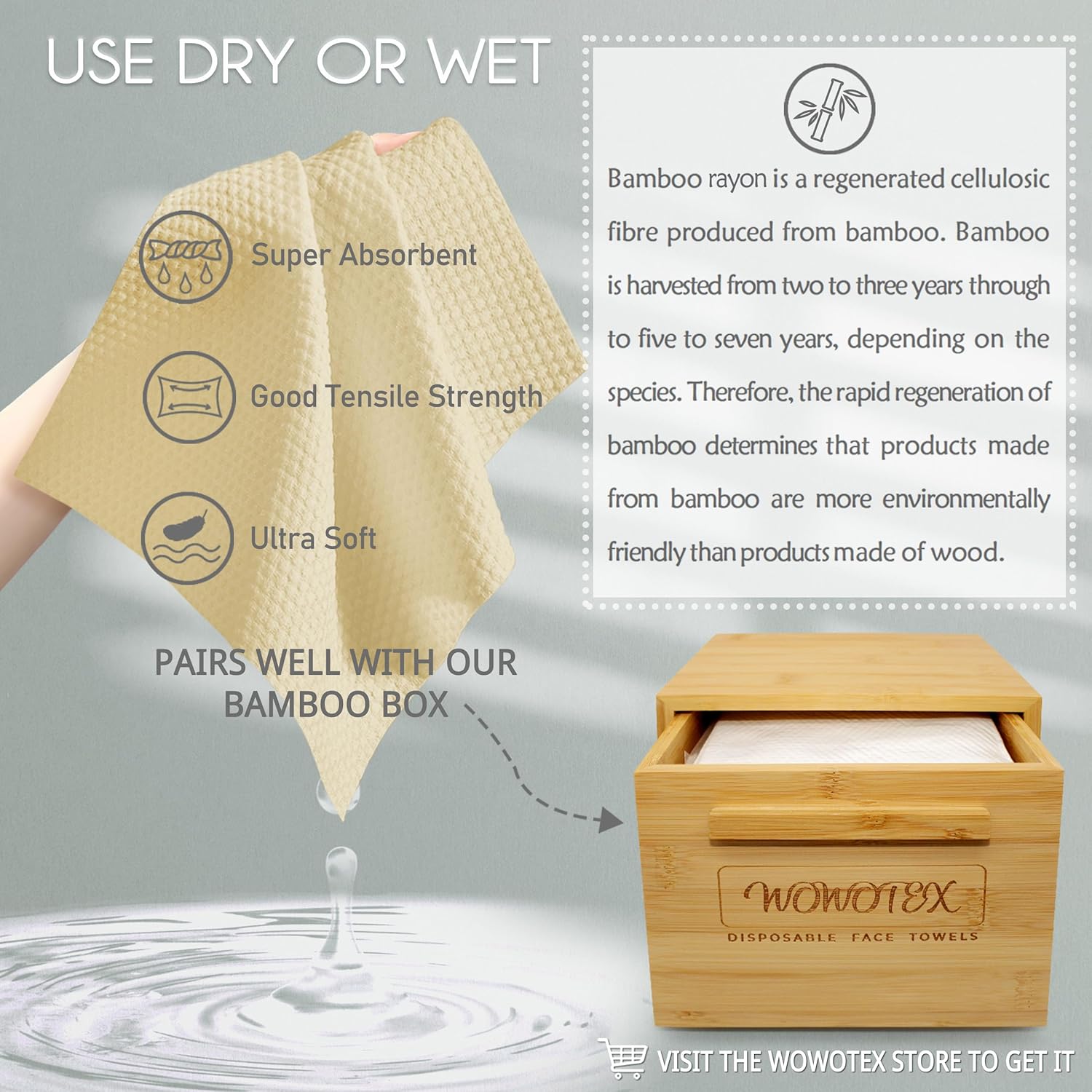 - EXCELLENT FABRIC : WOWOTEX face towel is made of bamboo rayon which is 100% biodegradable. WOWOTEX face towel can be used wet or dry, our face towel is super soft and highly absorbent, with good tensile strength, which can bring users a high quality user experience.
