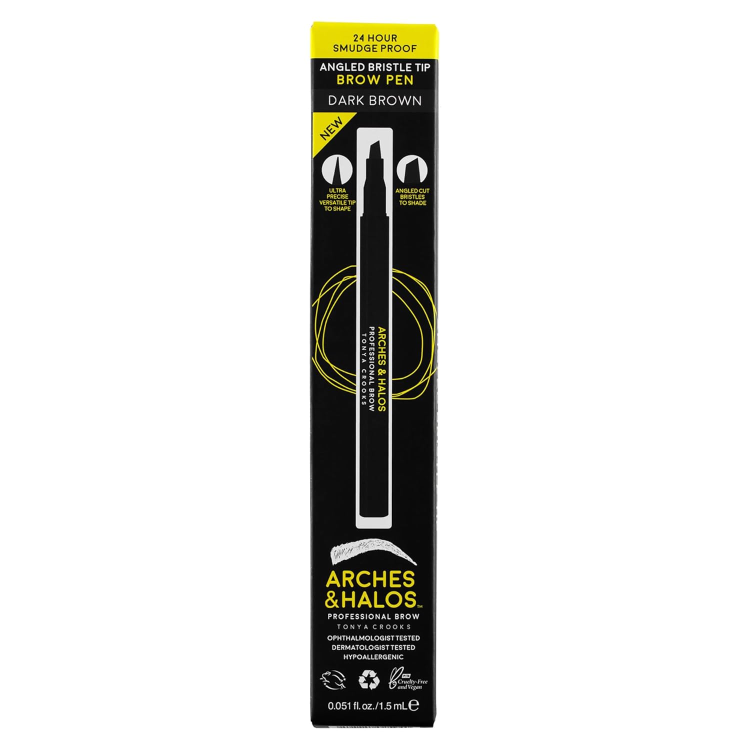 Arches and Halos Angled Bristle Tip Waterproof Brow Pen - Water Based and Smudge Proof Eyebrow Pencil - Extended Wear - Dark Brown - 0.051 oz