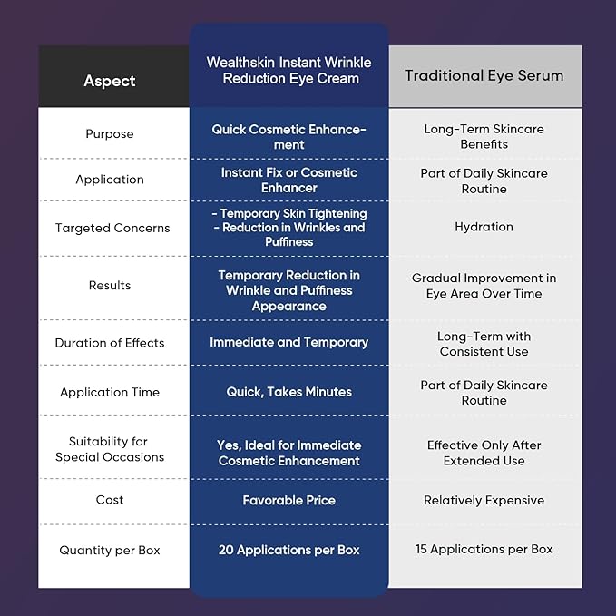 - Rapid & Temporary Benefits: Wealthskin Instant Rapid Wrinkle Eye Cream swiftly reduces wrinkles on the eye, face, and neck, providing a temporary firming effect. Film-forming agents help smooth wrinkles and briefly diminish puffiness by tightening the skin, yielding an instantly more youthful appearance.