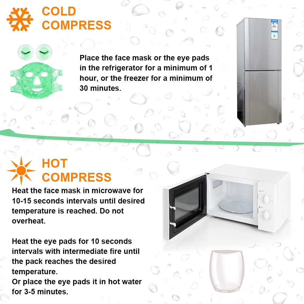 - 【Convenient to Use】Simply store the cooling eye masks in the freezer at -18℃ or lower temperature for at least 2 hours. For better effect,the best freezing time is 2-6 hours.heat the cooling face mask in microwave in 10-15 seconds intervals until desired temperature is achieved,the maximum heating time does not exceed 30 seconds.