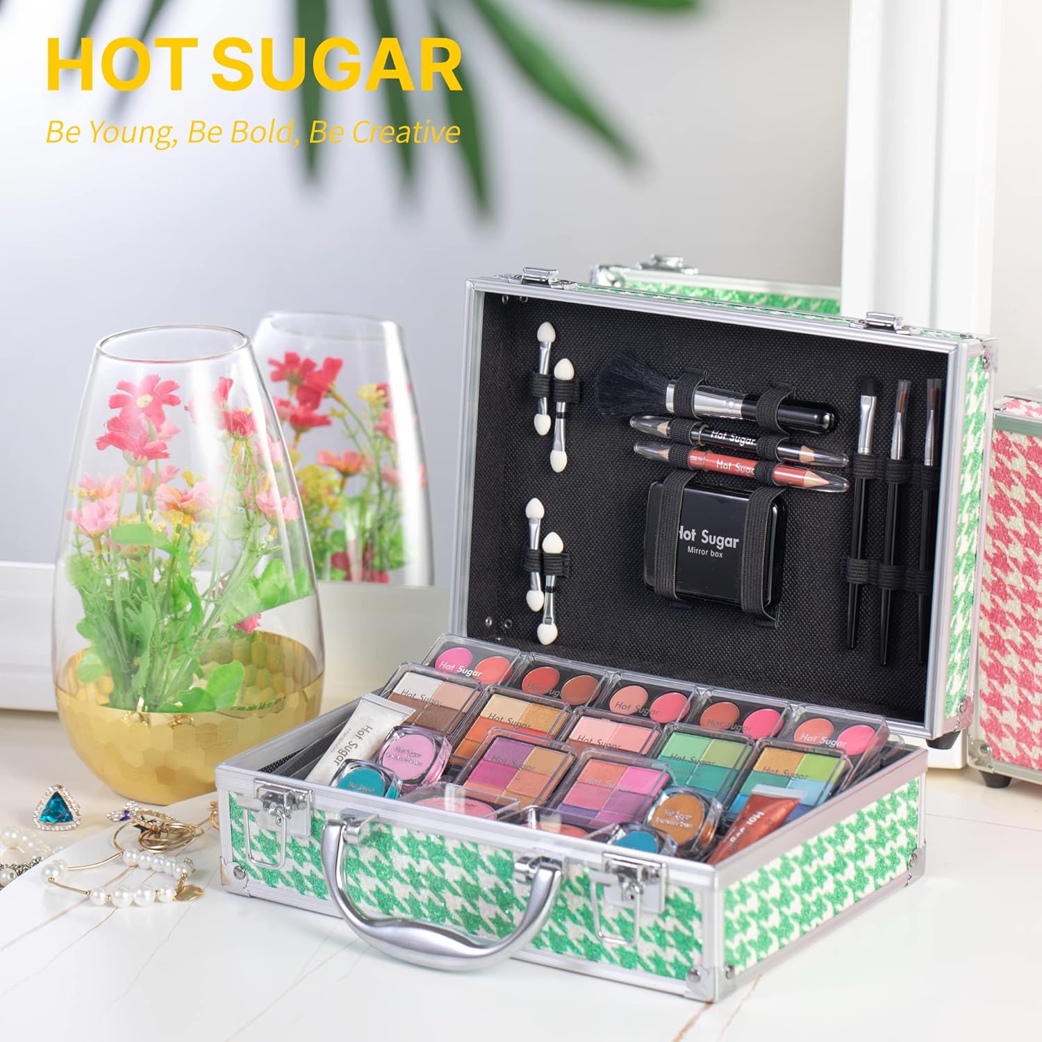 Hot Sugar Teen Makeup Kit for Girls 10-13 Full Starter Cosmetics Set with Eye Shadow Lip Balm Blush Lip Gloss Brush Lip Pencil Eye Pencil and Mirror (GREEN HOUNDSTOOTH)