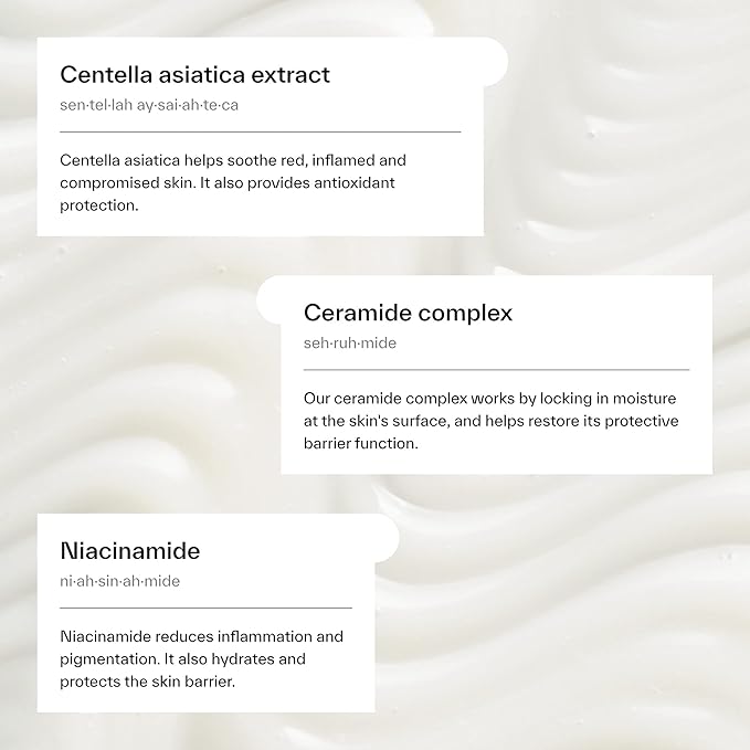 - Combination of ceramides & niacinamide lock in moisture & repair the skin barrier whilst cooling & soothing blemishes. Stimulates collagen production in your skin, improving its overall structure & reducing the appearance of fine lines & wrinkles