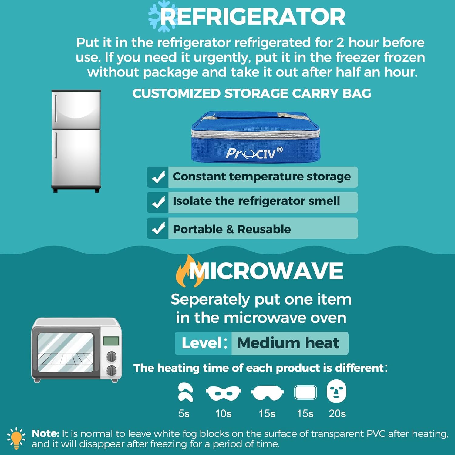- โ๐ฅโใHot and Cold CompressใProCIV gel eye mask set can be chilled in the refrigerator for use as an ice pack, or heated in the microwave as a heated eye mask. Has good temperature storage effect, ๐๐๐๐ฉ ๐๐๐/๐๐๐ซ๐ฆ for up to ๐๐-๐๐ ๐๐ข๐ง๐ฌ. Effectively amazing for tired eyes relief, fatigue, dark circles, puffiness and the wrinkles. Note: Put it in the ๐ ๐ซ๐๐๐ณ๐๐ซ frozen for ๐๐จ ๐๐จ๐ซ๐ ๐๐ก๐๐ง ๐๐๐ฅ๐ ๐๐ง ๐๐จ๐ฎ๐ซ. If the time is too long, it will become frozen and hardened.