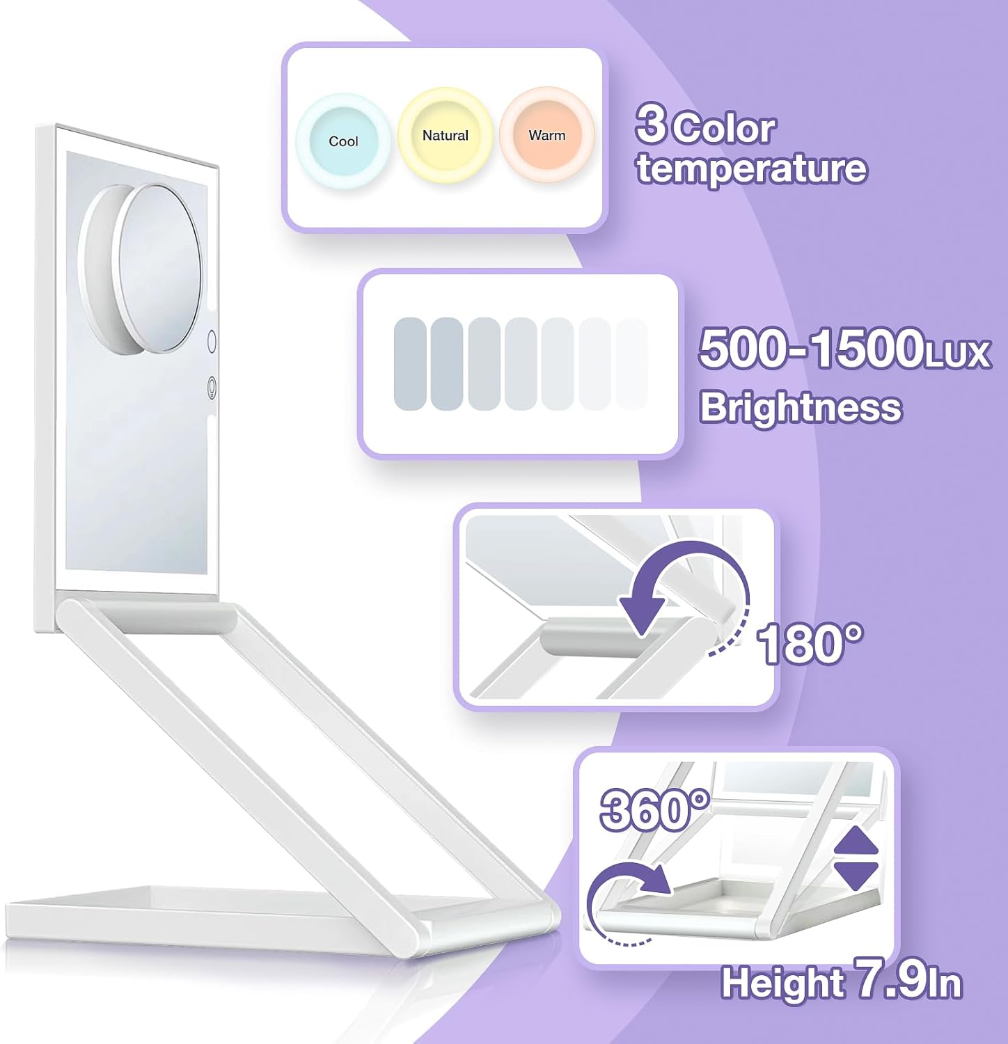 - VERSATILE HD PREMIUM MAKEUP MIRROR:This mirror can switch to multi-angles to meet your various needs. The built-in light makes the mirror serve as a desk lamp, can be used as a bracket for mobile phones and a storage for personal cosmetics, it is more than a mirror.