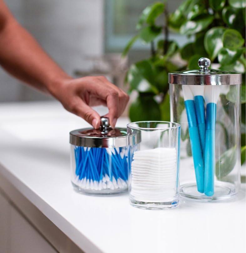 Huang Acrylic Chrome Lid Clear Cosmetic Container | Store Q-Tips, Cottonballs, Cotton Rounds | Perfect Counter Top or Shelf Storage | Small