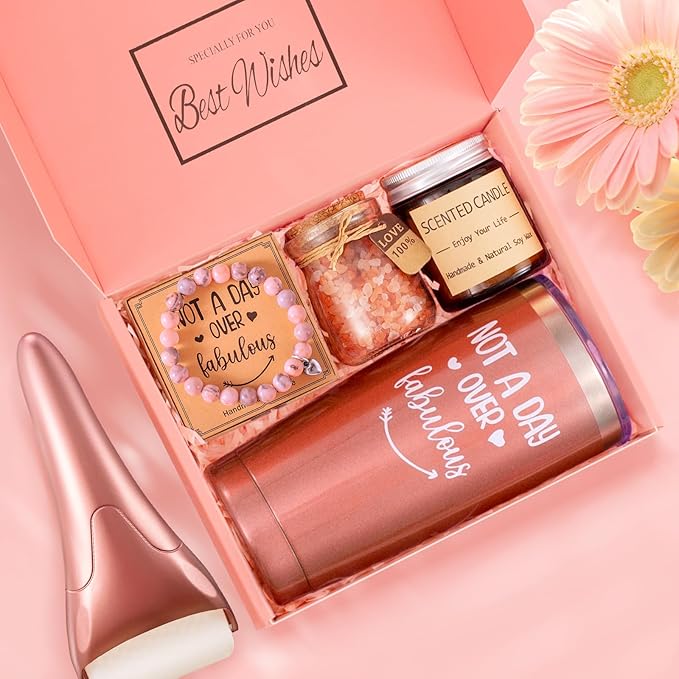 - Personalized CHristmas Gifts for Women - 6 in 1 Women Christmas Gifts set contains 1 x 20oz rose gold stainless steel insulated tumbler written with "Not A Day Over Fabulous", 1 x ice roller, 1x beautiful stone bracelet, 1 x handmade scented candle, 1 x bath salt and a personalized greeting card. The beautiful and luxury gift box will be the best gifts for mom, she will feel surprised and spoiled when unboxing. Ideal Christmas gifts for women who want nothing
